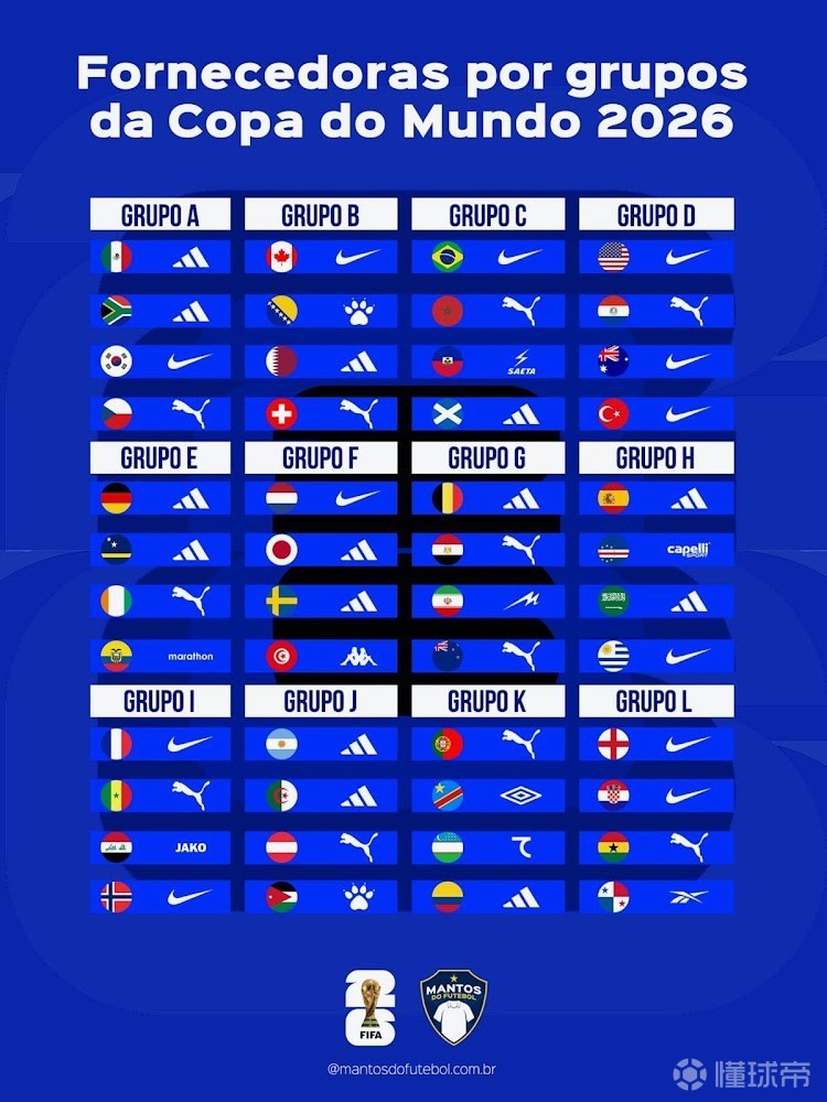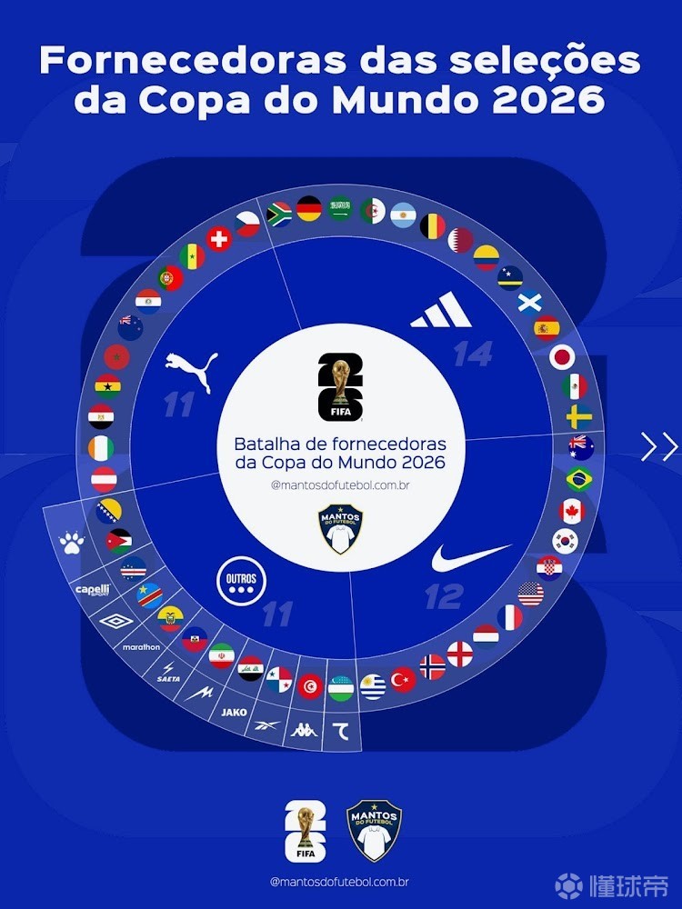 4月2日,根据球衣装备网站Footyheadlines最新统计,2026年世界杯48支参赛队中总共有13种球衣品牌,有超过77%的球队由阿迪达斯、耐克和彪马提供球衣。